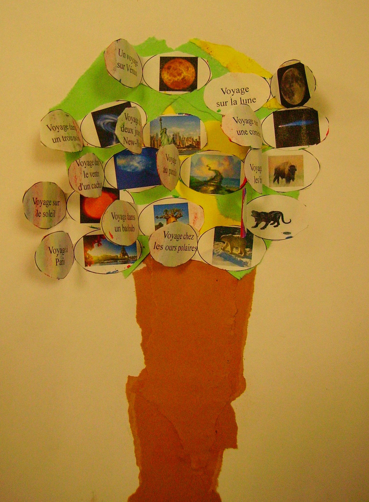 l'arbre à voyages (en couverture de l'article): l'élève a confectionné des mini étiquettes qui s'ouvrent avec à l'intérieur,une toute petite photo et le nom de la destination!