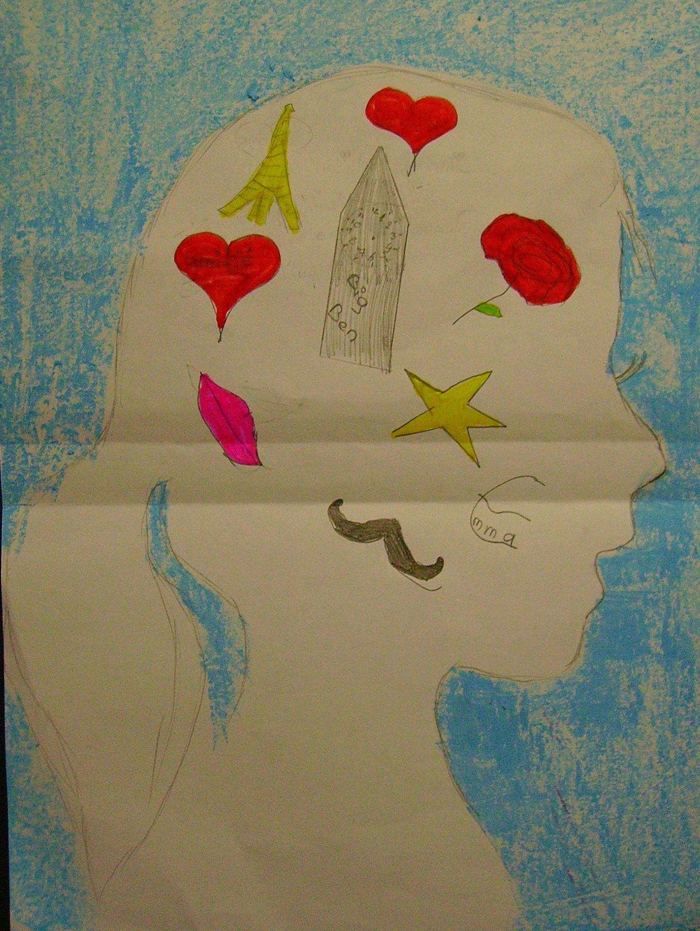 Il fallait ensuite dessiner « ce qu’on a dans la tête », thème assez vaste pouvant inclure : les choses auxquelles on pense souvent, les choses que l’on aime, un air de chanson , le nom de ses amis, de son amoureux ou de ses vedettes préférées… ou tout ça à la fois !