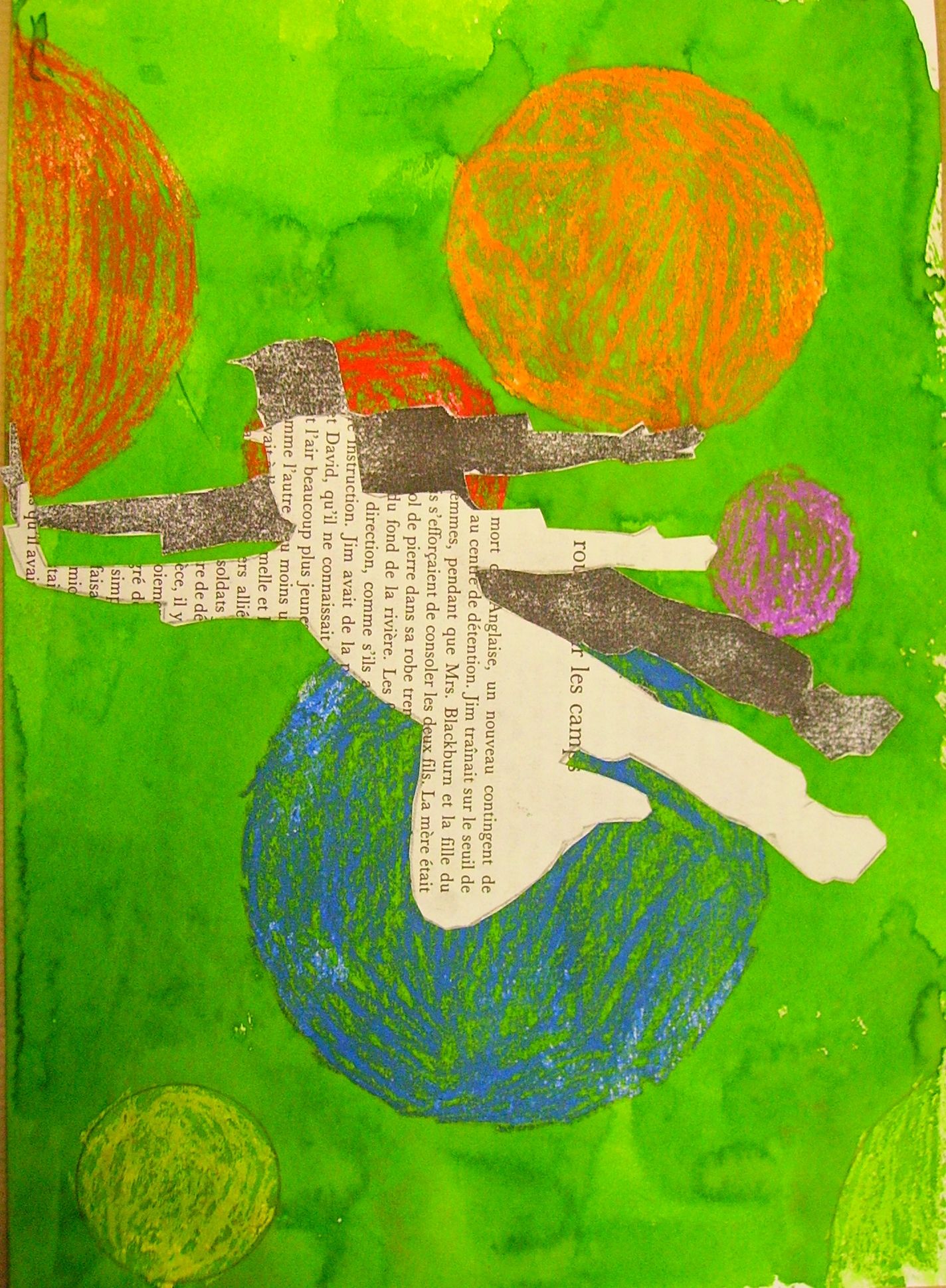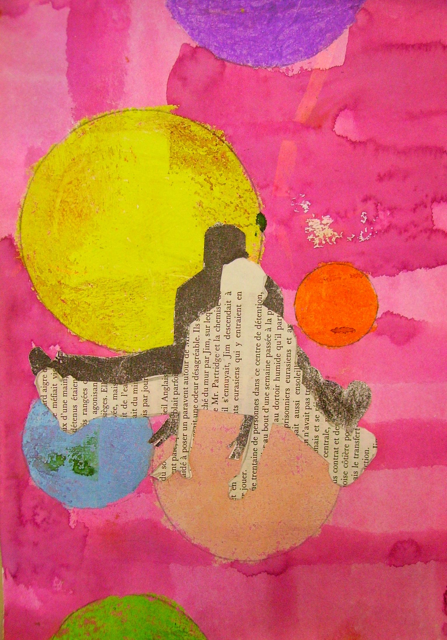 Fond : cercles de différentes tailles tracés au compas et coloriés au pastel à l’huile + encre aux couleurs vives pour une ambiance « pop ».