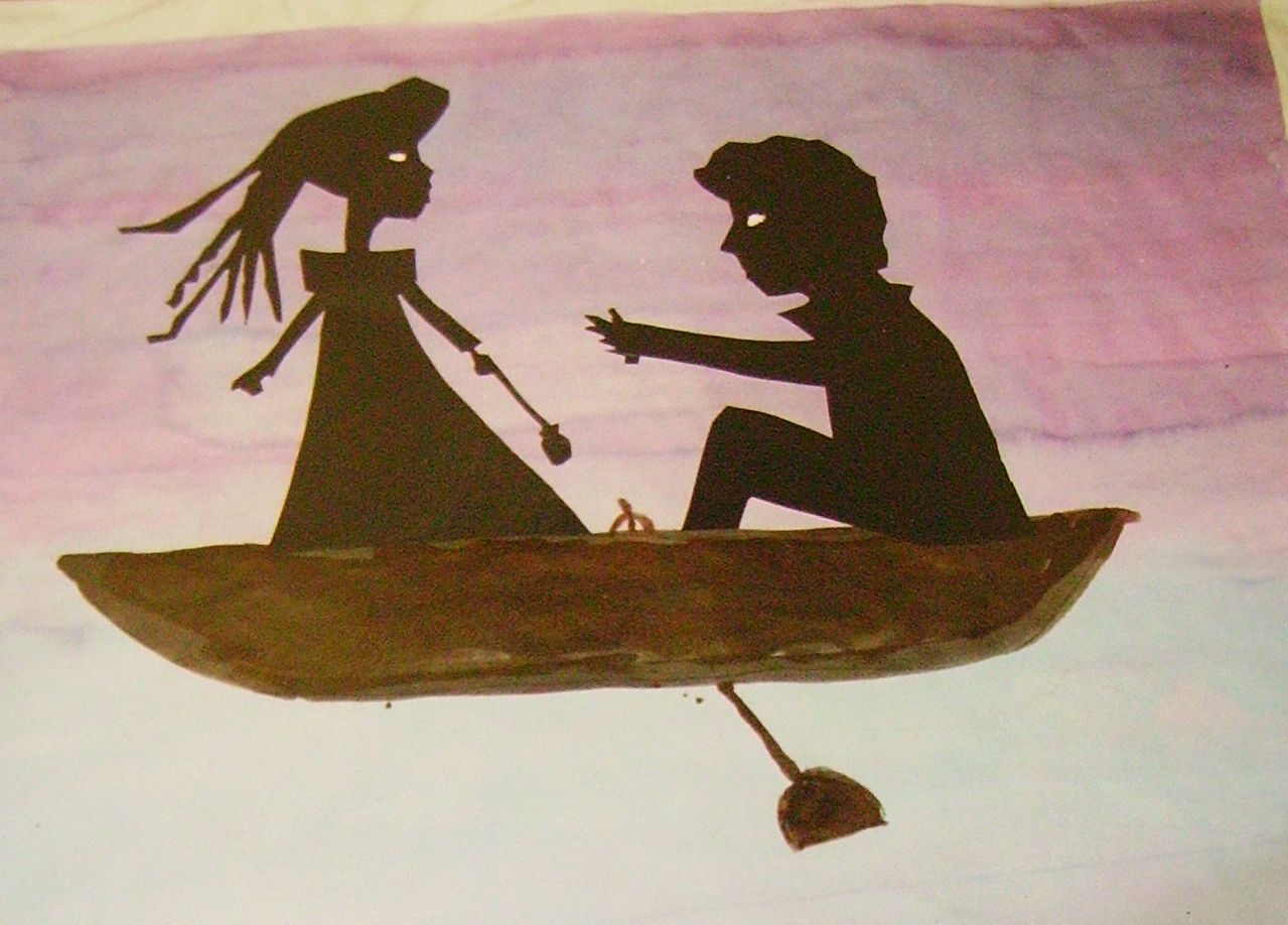 Silhouettes décalquées dans des livres de contes ou dessinées puis découpées dans du papier canson noir et fond à l'encre diluée à l'eau passée au rouleau.