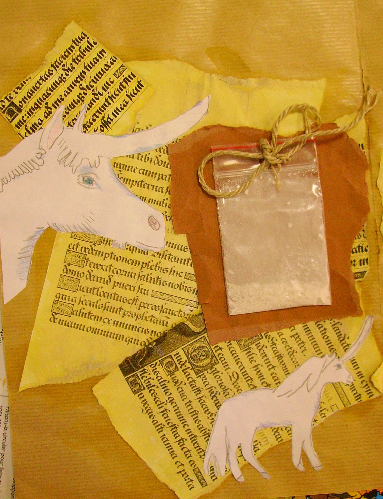 Sachet contenant "de la poudre de corne de Licorne" aux vertus guérisseuses (une craie du tableau broyée sous le pied !!!)