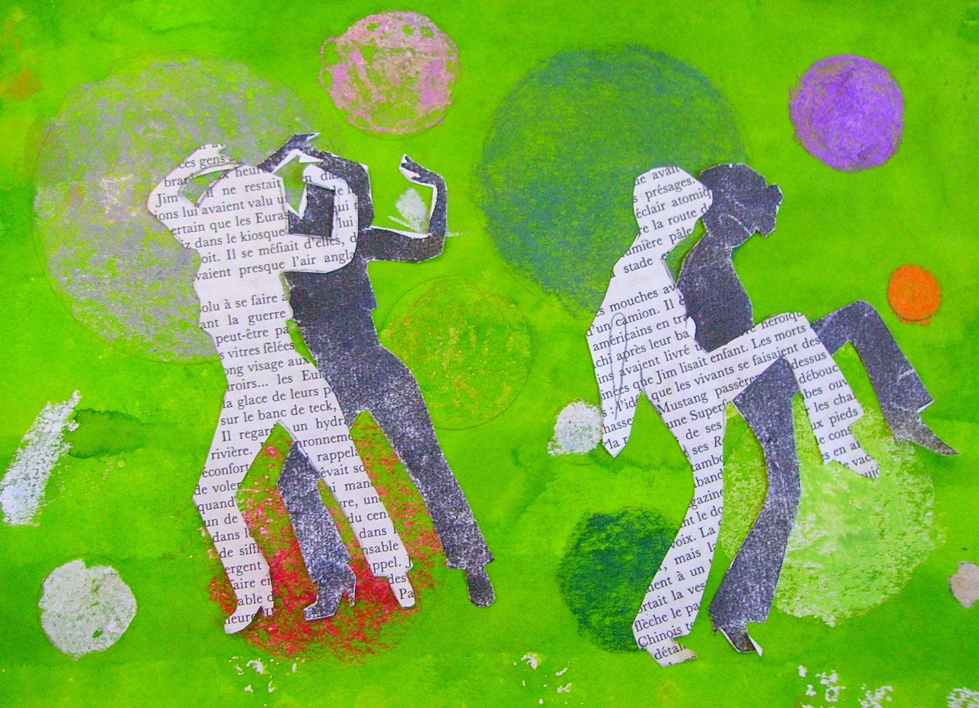 Silhouettes noires de danseurs trouvées sur internet, découpées, reportées et reproduites sur une feuille imprimée (page de vieux livre ou partition de musique pour coller d’avantage au thème) .